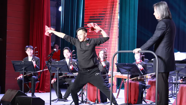 北京民族乐团副团长宋艺博以打击乐领奏登场,演绎经典乐曲《龙腾虎跃》。本次漠河演出中,宋艺博团长更兼任本场演出导演,结合漠河民俗特色,在乐曲编排上融入诸多创意灵感,以专业创排与精彩领奏,尽显诚意与实力。