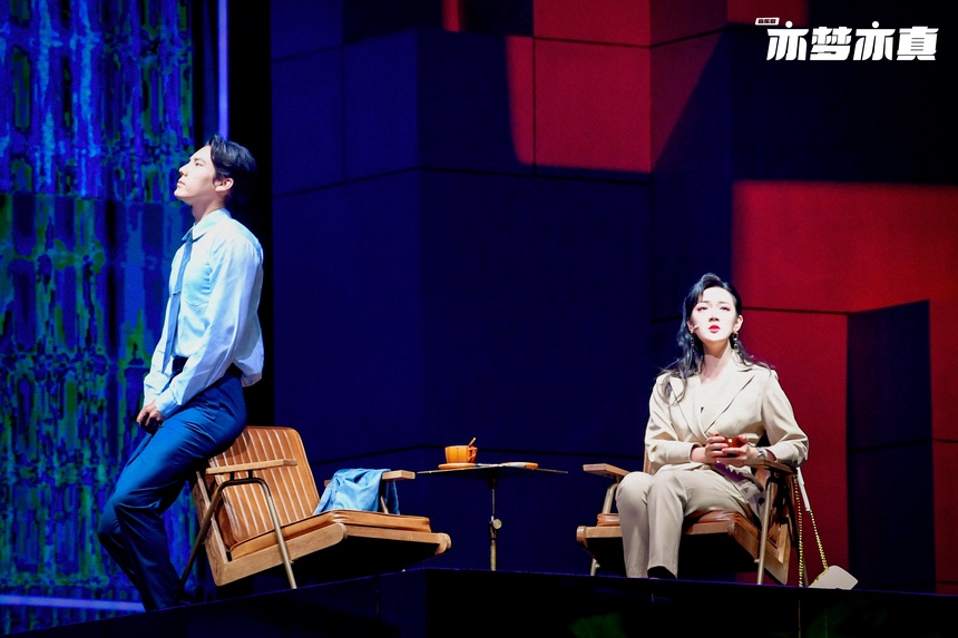 不得不提的还有《亦梦亦真》的舞台美术。两块巨大的电子屏作为舞台上的背景墙,随着情节发展而变幻光影,有着清晰的叙事性。两三层简单的叠台,让舞台上的时空挪移在不动之中快速切换。在国产音乐剧方兴未艾之际,《亦梦亦真》紧扣自主芯片研发的大主题,同时又关注到社会每一个层面人群的生存状态和积极向上的逐梦追求。尽管首轮演出的场次尚不足以让剧中的每一个细节都在精打细磨中焕发光彩,但相信经过今后多轮的演出,该剧会有一个更加精彩、炫目的呈现。