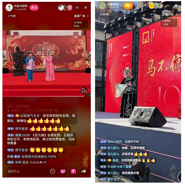 本次文化季中,多位“文化推荐官”与各点位演出联动,同广大网友一起“云”过年,首日直播反响热烈。北京市河北梆子剧团官方账号和演员账号在隆福寺同步直播,结合现场演出进行幕后解读,吸引近万人在线观看;中国评剧院《花为媒》快闪直播半小时内获超3000次点赞。线上线下联动,让新春文化氛围突破时空限制,传递至更多人群。